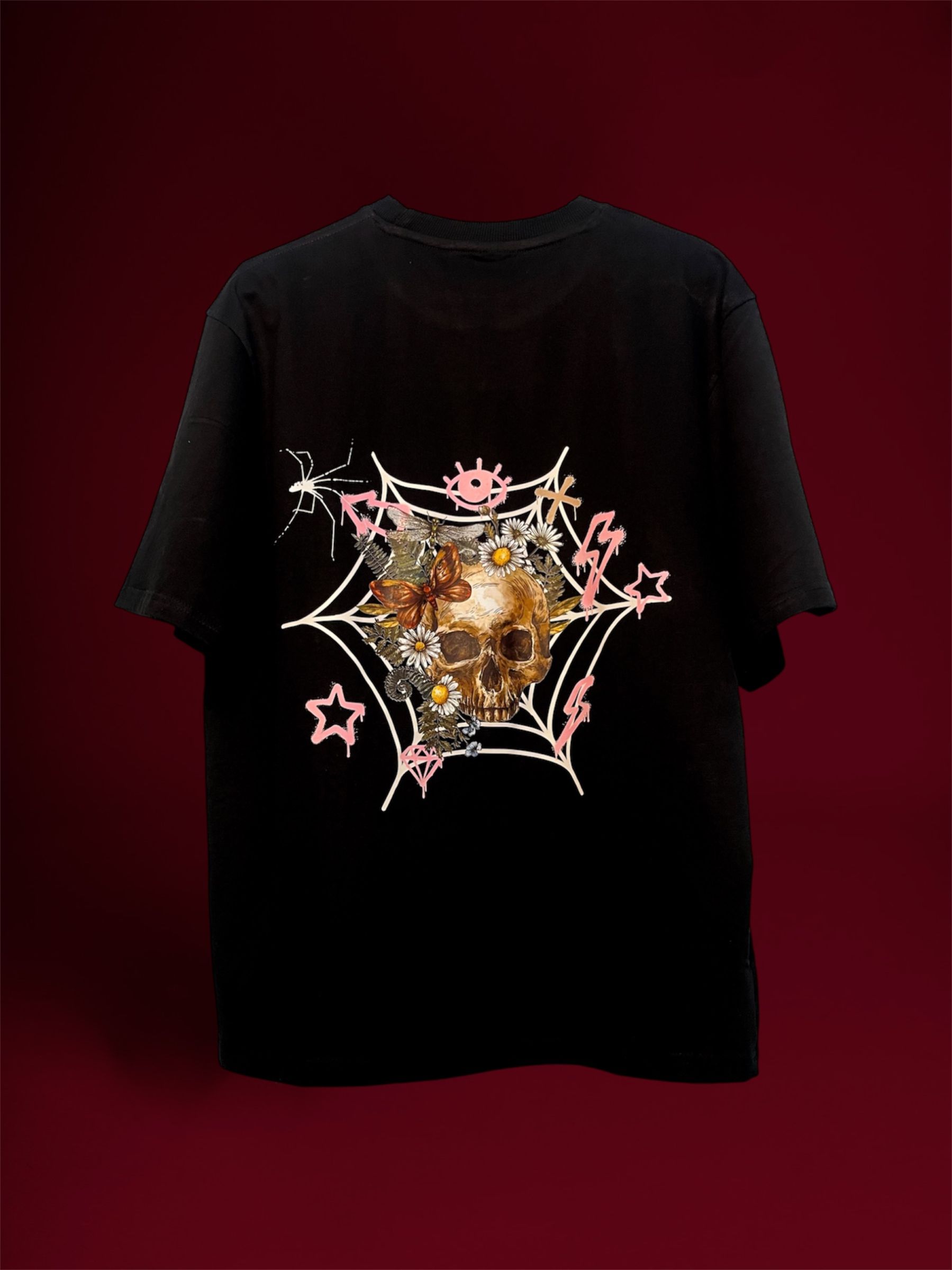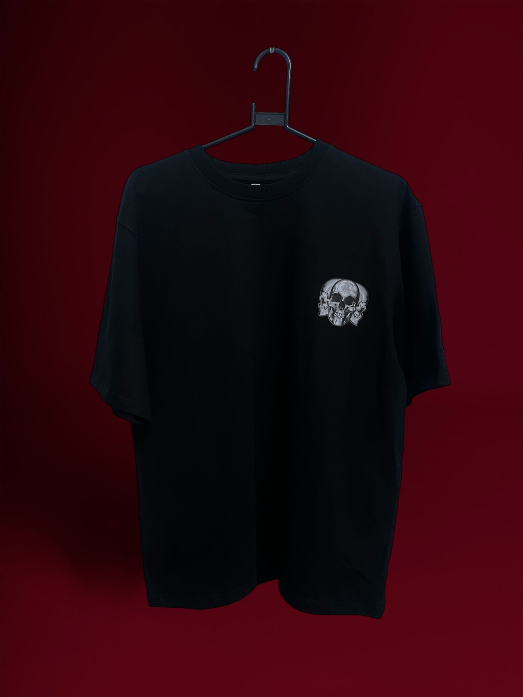 Skull & Bloom Web Graphic Black Unisex Over Sized T-Shirt with Three Face Skull on Front